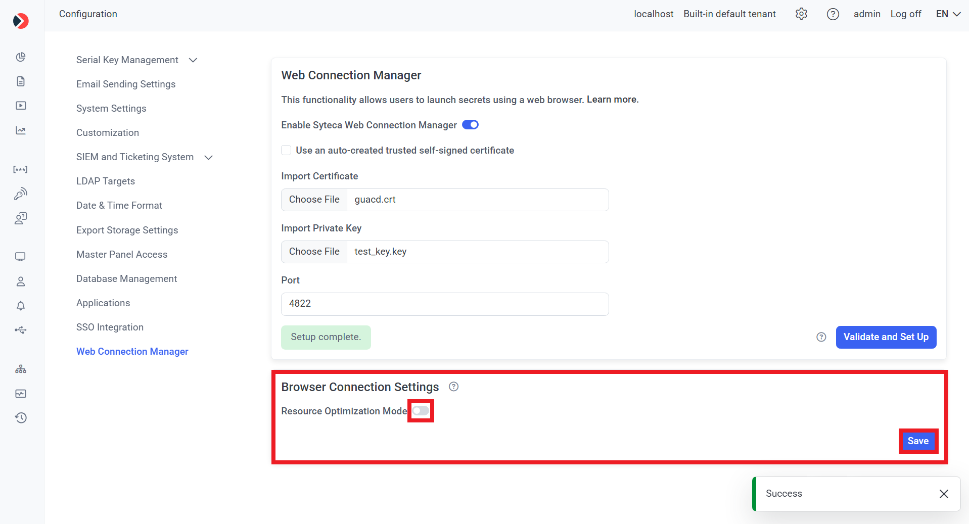 4) Optionally, in the Browser Connection Settings section, move the Resource Optimization Mode toggle to left to disable it, and then click the Save button (in the bottom right).