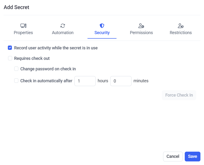 If recording user activity is required, the Record user activity while the secret is in use checkbox needs to be selected to enable this functionality in all the required secrets.