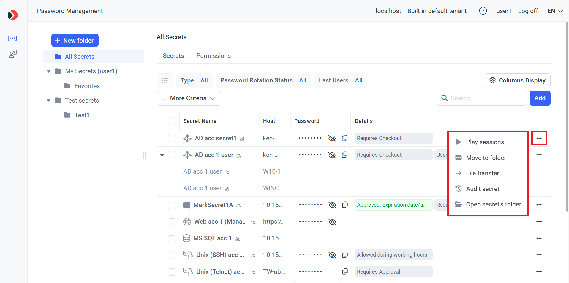 As shown in the screenshot above, this functionality consists of the following 2 options for use, available directly from the Management Tool to users with any administrative permission (who have been granted the corresponding Role Type permissions to use each secret to connect to the corresponding account):