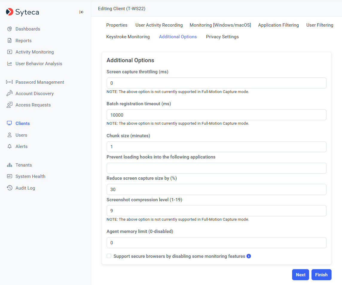 h) The Support secure browsers by disabling some monitoring features option allows an administrator to disable some hooks to allow secure browsers to be used, which means that a few monitoring features may not function correctly: detecting some file upload operations, keystrokes in RDP sessions, switching the active window, changing the monitoring language or layout, keystrokes using Polish diacritical characters.