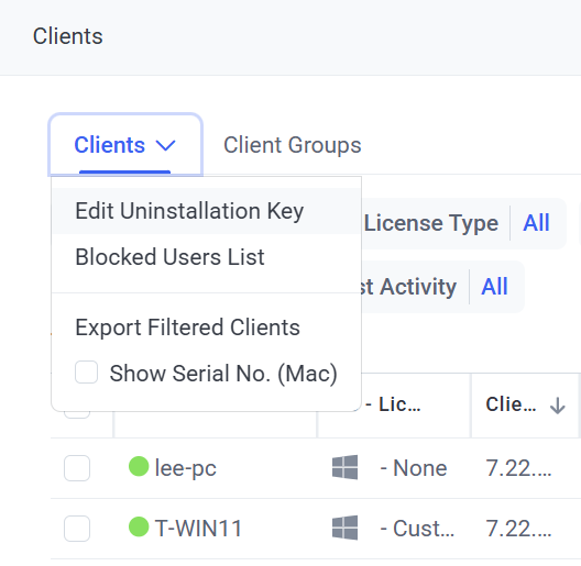 3. On the Clients page that opens, click the icon next to the Clients tab, and then select Edit Uninstallation Key in the drop-down list.