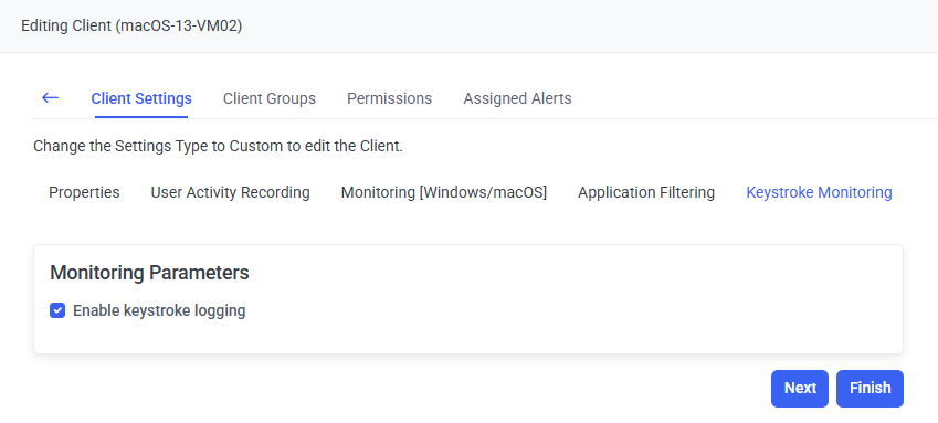 If the Enable keystroke logging checkbox is selected (on the Editing Client / Editing Client Group page, on the Keystroke Monitoring tab, in the Monitoring Parameters section to enable this option, the macOS Client logs the user’s keystrokes.