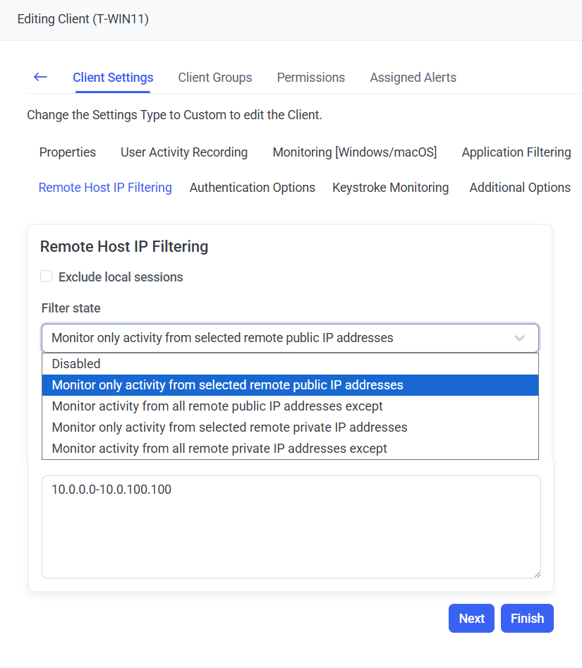 Remote host IP filtering allows you to reduce the amount of information received from the Windows Client by defining IP addresses for which remote sessions will not be monitored.