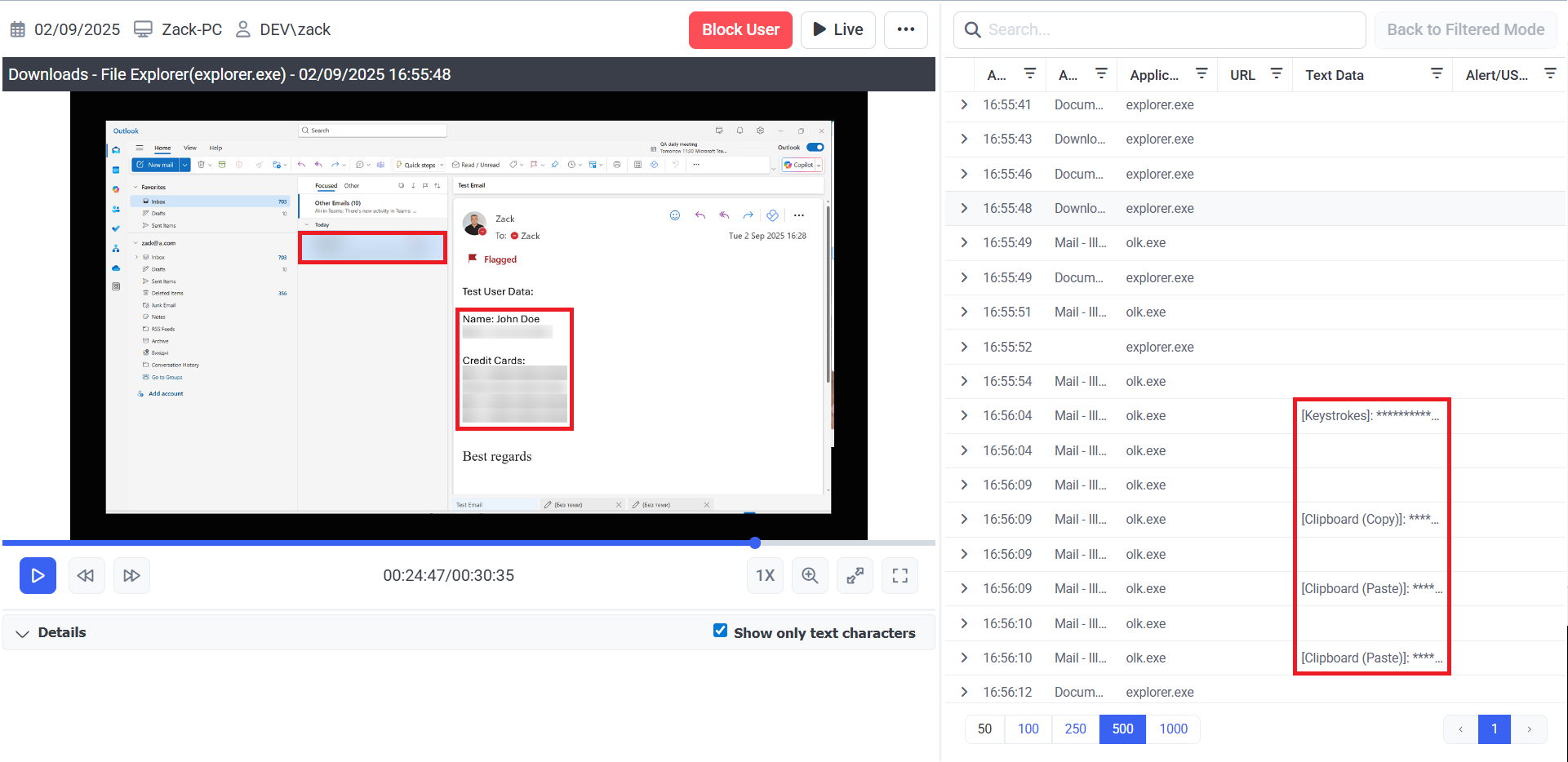 So, as well as detecting all user actions, Syteca can also detect the clear text data displayed on the screen and recorded (including data cut/copied/pasted or typed on the keyboard by users) that is stored in clear text, such as: