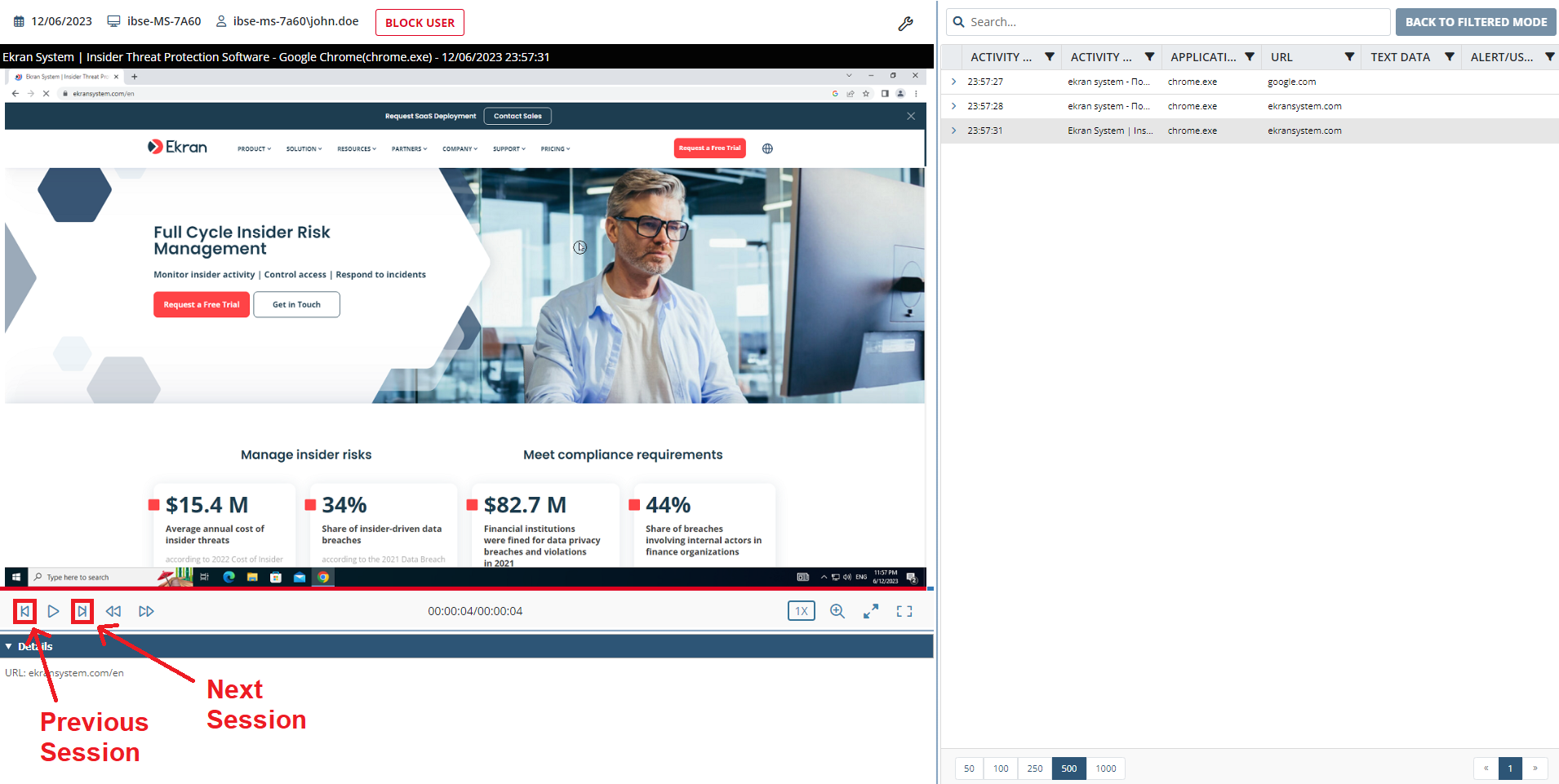 NOTE: Alternatively, the Previous and Next ( buttons in the Session Player can also be used to switch between adjacent records. It should also be noted that switching between records, actually means switching between screen captures, and therefore, since each record may contain multiple screen captures frames, these buttons will not always switch between the records (in the Metadata grid) every time they are clicked (in the event that there is more than one screen capture in the record concerned). In a similar way, some records may not contain any screen captures, and will therefore be skipped.
