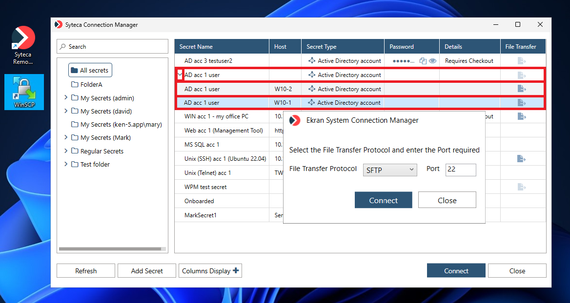 When the File Transfer feature is configured for a secret, and the permissions are enabled for a user of a secret, the user is able to transfer files to/from the remote computer by way of this secret in the WCP application, instead of directly connecting to the remote computer (by clicking the Connect button) in Syteca Connection Manager.