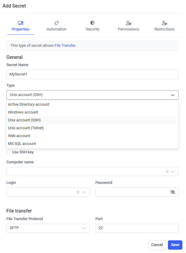 NOTE: [For Unix account (SSH) secrets only:] The "FTP" protocol cannot be used together with the "Use SSH key" option.