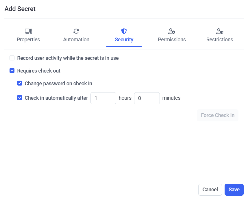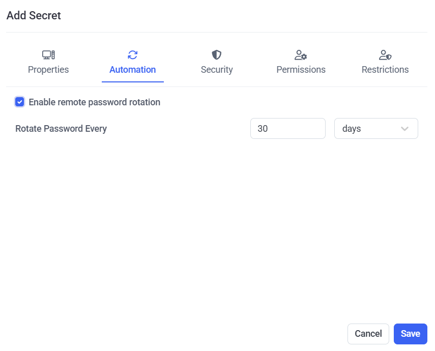 4. On the Automation tab, select the Enable remote password rotation checkbox, and specify the frequency of rotation of the secret’s password.