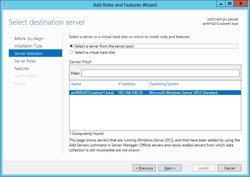 5. On the Server Selection page, select the Select a server from the server pool option, and then select your server from the Server Pool list, and click Next.