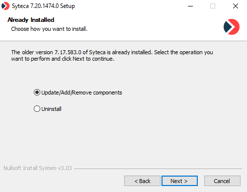 5. On the Already Installed page, select Update/Add/Remove components, and then click Next.