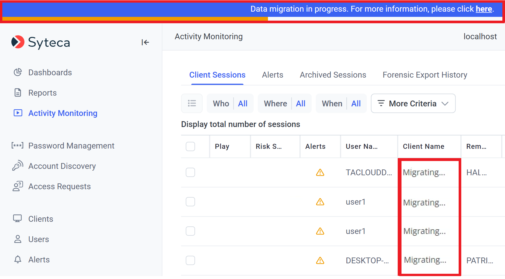 NOTE: Data migration takes place in the background and may take some time to complete. Client sessions migrate starting with the newest one and finishing with the oldest one, so some sessions will not open until migration is complete.
