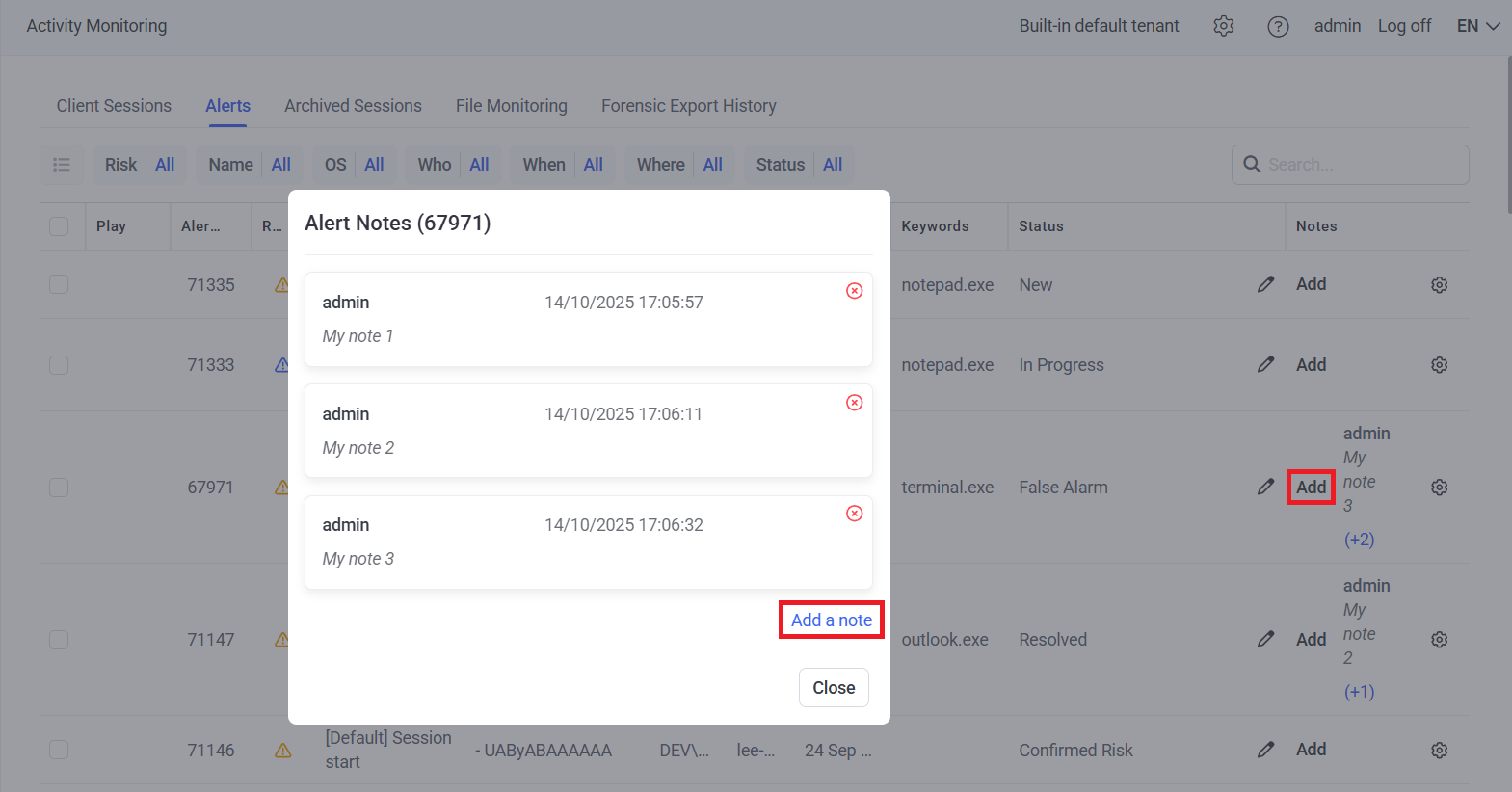 To view or add (or remove) Notes about an alert event, click the Add button next to the alert event required, and add (or delete) notes by using the Add a note button (or the Remove (
