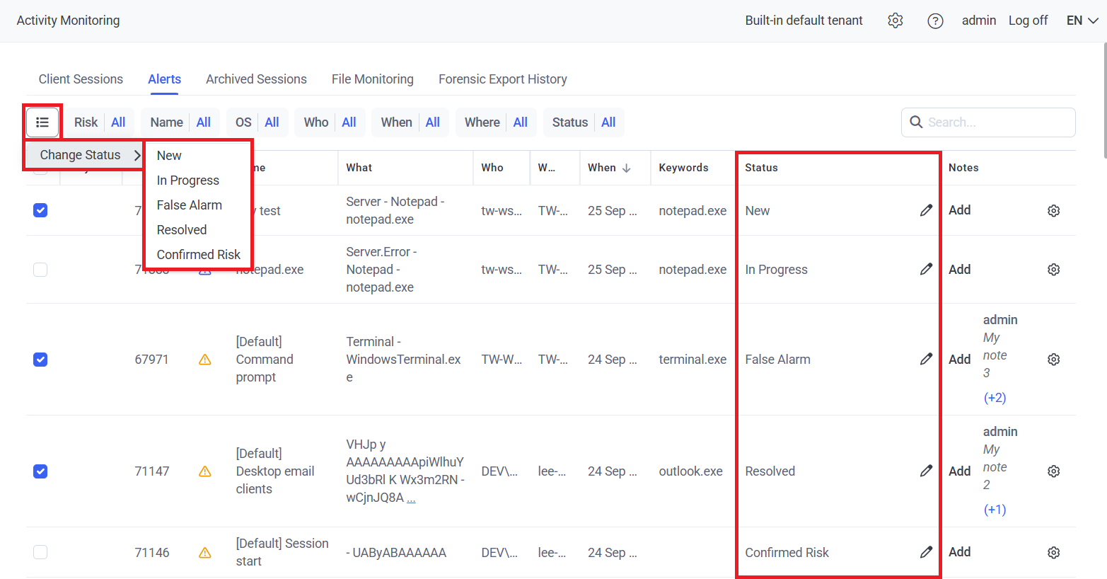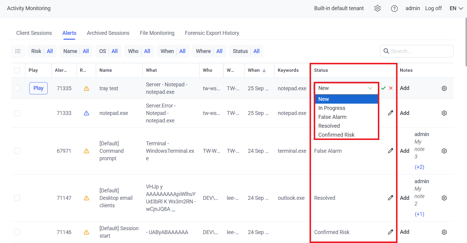 • Status: The status of an alert event (either Confirmed Risk / False Alarm / In Progress / New / Resolved, which can be changed by clicking the Edit (