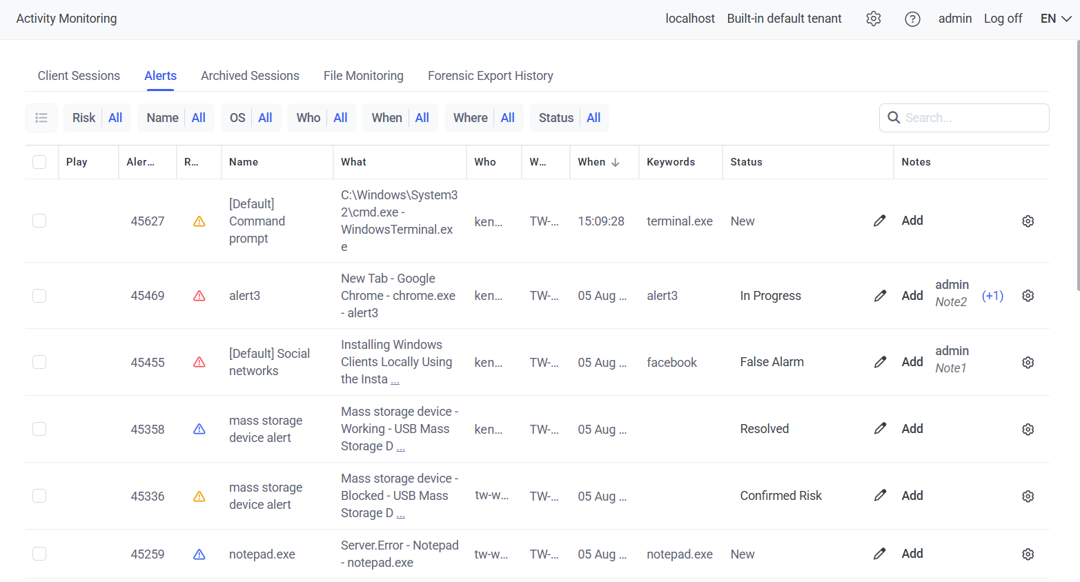 Whenever an alert (or USB monitoring rule) is triggered, a new record of the corresponding alert (or USB monitoring) event that occurred is added to the list displayed in the grid.