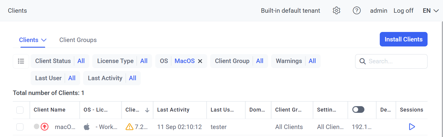 The macOS Clients can be viewed in the Management Tool in the list of Clients displayed in the grid (along with any Windows and Linux Clients) on the Clients page.