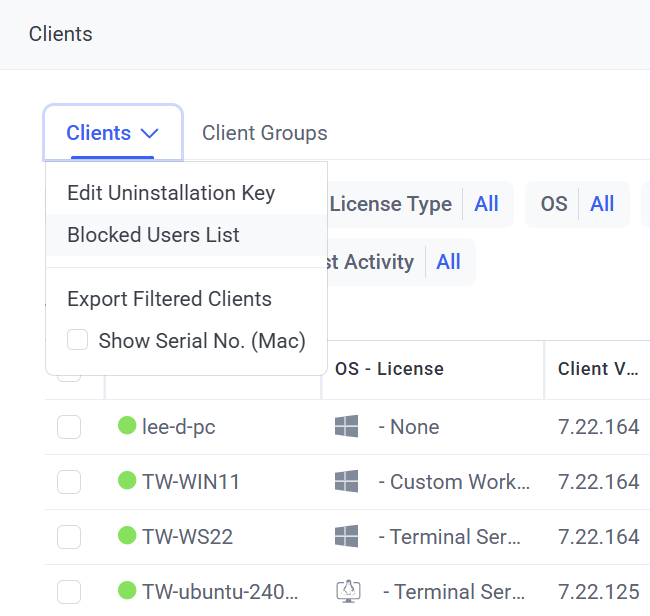 To view the Blocked Users list, click the Clients navigation link (on the left), and then click the Clients .png?inst-v=dd718f50-0025-440c-84b5-70bd5d1e852d)