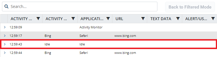 Idle activity of a macOS Client will be registered, and displayed in the Session Viewer as “Idle” in the Metadata grid if the appropriate monitoring options are enabled (i.e. the Detect system IDLE events and/or Register IDLE event when user is inactive checkboxes are selected), on the Editing Client / Editing Client Group page, on the Monitoring [Windows/macOS] tab, in the Monitoring Parameters section at the top.