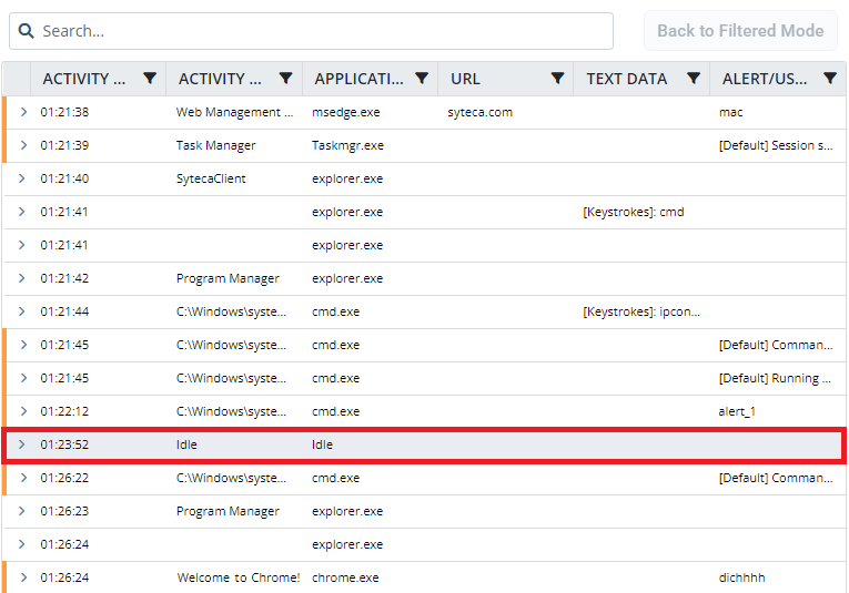 Idle activity of a Windows Client will be registered, and displayed in the Session Viewer as “Idle” in the Metadata grid if the appropriate monitoring options are enabled (i.e. the Detect system IDLE events and/or Register IDLE event when user is inactive checkboxes are selected), on the Editing Client / Editing Client Group page, on the Monitoring [Windows/macOS] tab, in the Monitoring Parameters section at the top.