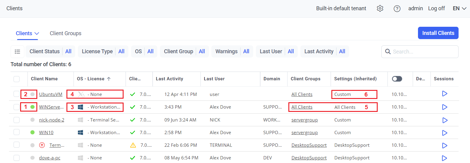 NOTE: In the screenshot above, two Clients are shown (where: 1 = Client is online; 2 = Client is offline; 3 = Client has the appropriate license, 4 = Client does not have a license; 5 = Client inherits its settings; 6 = Client uses its own settings).