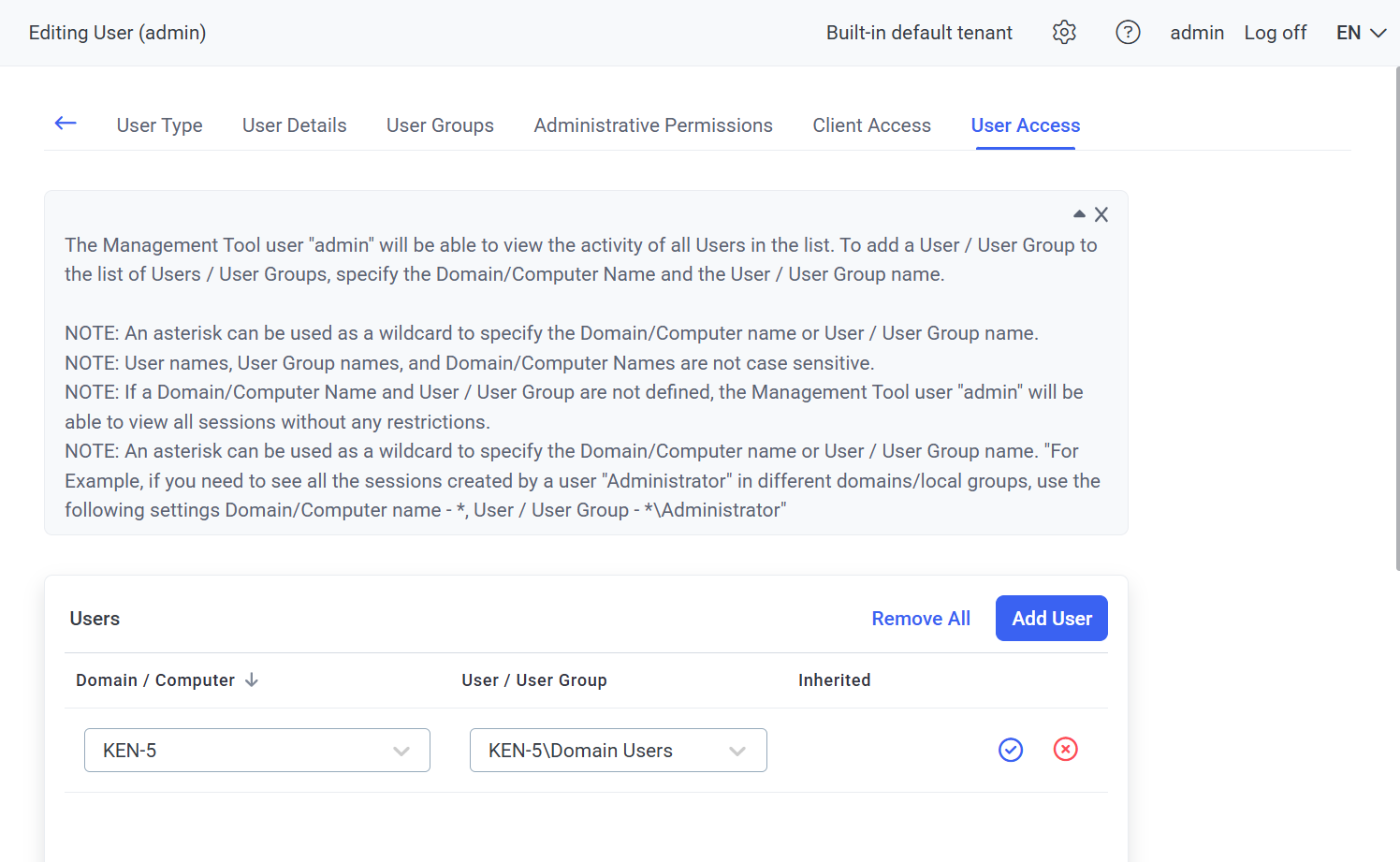 NOTE: In the screenshot above, the "admin" user being edited has permission to view the sessions of endpoint users who are in the "KEN-5\Domain Users" AD group only, which means that the "admin" user will not be able to view the sessions of any other users. If the table in the grid is empty, the "admin" user will be able to view the sessions of all endpoint users (i.e. without any restrictions).